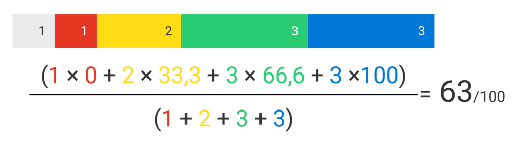 Für jeden Treiber einer Umfrage wird ein Index auf Grundlage der unterschiedlichen Antworten der Befragten berechnet. Für den am häufigsten vorkommenden Fragetyp – die 4-stufige Smiley-Skala – wird der Index wie folgt berechnet: