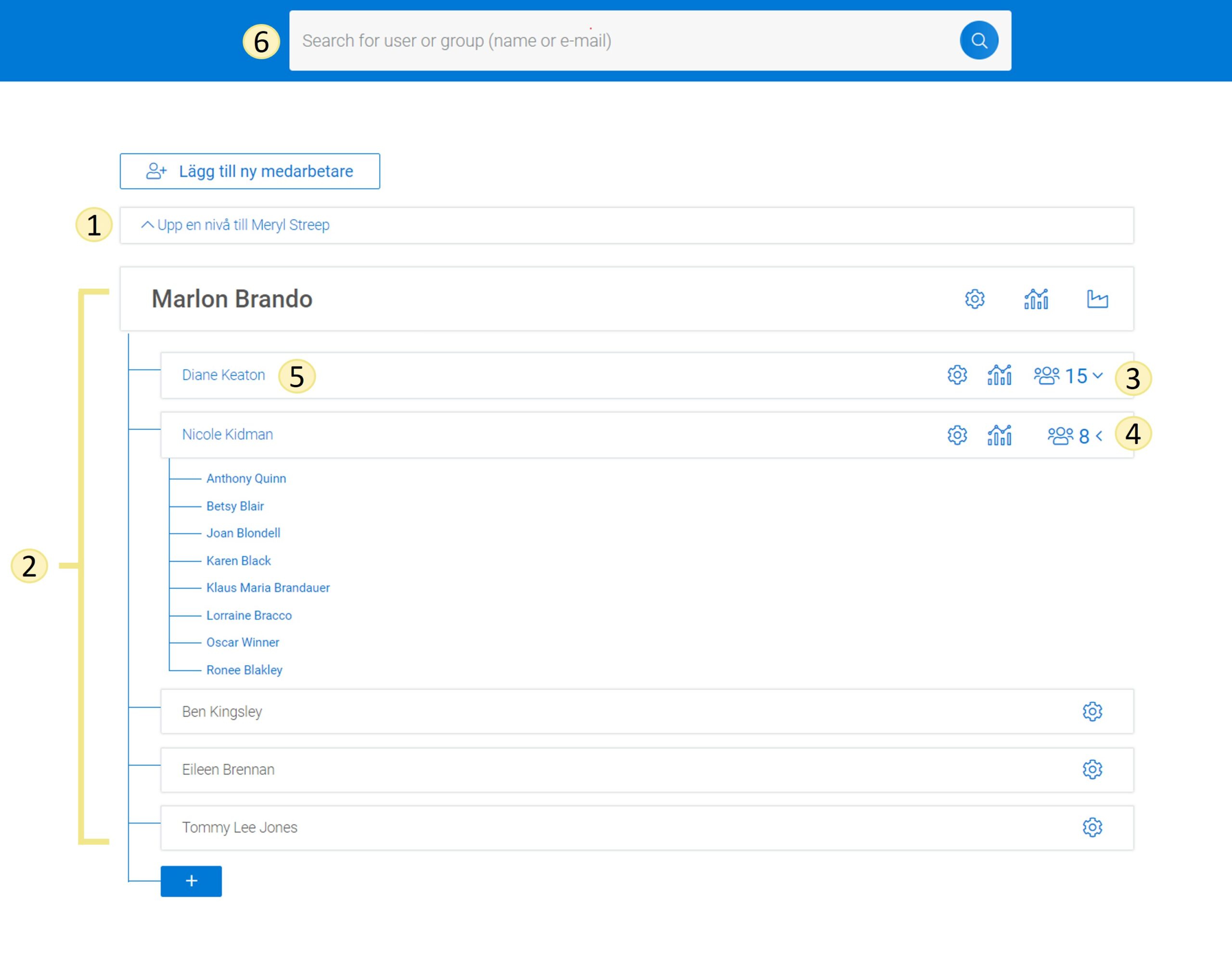 - Wenn ein Benutzer Untergebene hat, werden diese unter ihm/ihr aufgelistet.