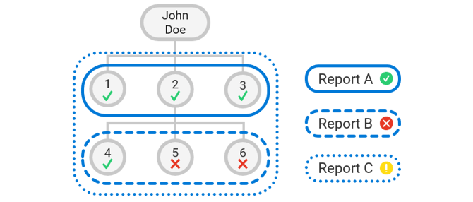 Since all of John's direct reporting employees responded to the survey, John's team report (Report A) will be available (as the number of answers is equal to the anonymity threshold). Since there is only 1 answer in User 2's team, she will not get a separate report (Report B) for this specific cycle. This means that in the report for John's full organization (Report C), the answer from User 4 will be hidden to protect User 4's anonymity. The reason for this is that it would otherwise be possible to identify the answers from User 4 by comparing reports A and C (the difference would be equal to User 4's answers). In this case, Report A and Report C thus become identical.