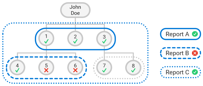 Since all of John's direct reporting employees responded to the survey, John's team report (Report A) will be available (as the number of answers is equal to the anonymity threshold). Since there is only 1 answer in User 1's team, she will not get a separate report (Report B) for this specific cycle.