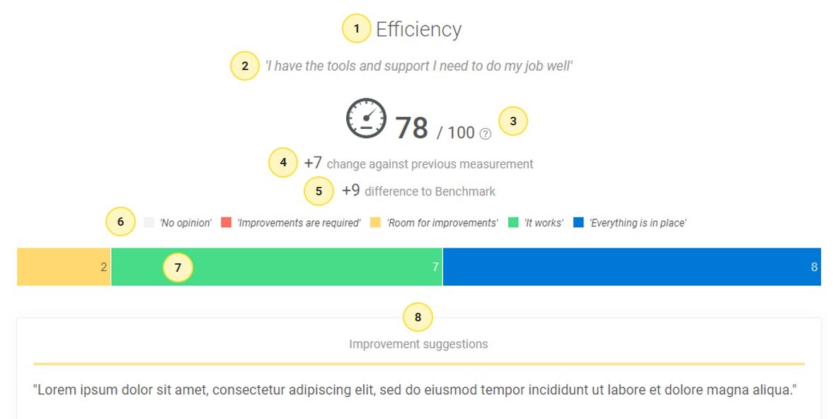 The Spread report offers a detailed breakdown of a specific survey cycle, including the answer distribution, index and submitted text comments for each individual driver. Below is a description of the different elements in the Spread report (see the picture for number references):