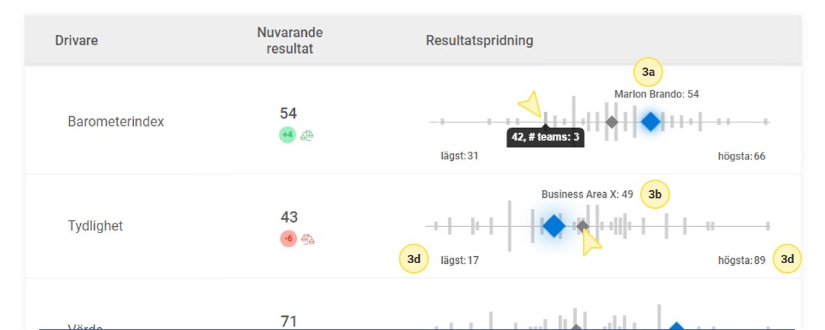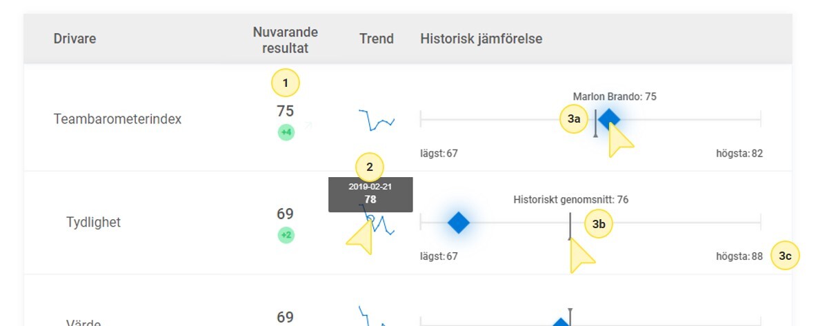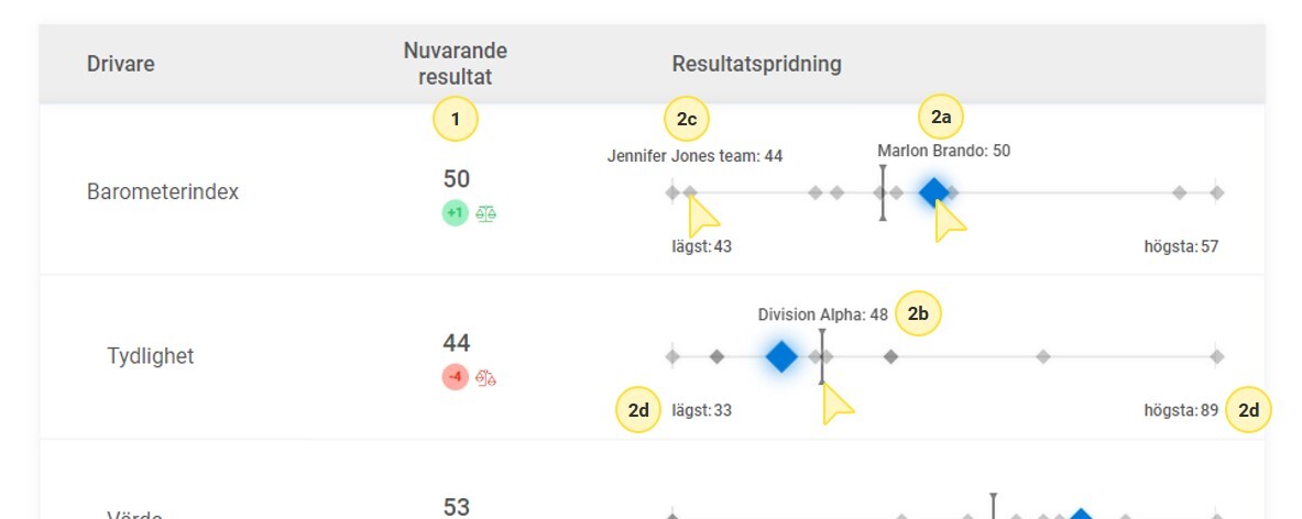 Tidskontextgrafen visar jämförelser med de egna historiska resultaten för det valda rapportscopet, både för huvudindexet och för varje individuell drivare. Nedan följer en beskrivning av de olika elementen i grafen (se bilden för nummerreferenser):- Nuvarande resultat - visar det senaste resultatet för det valda rapportscopet, samt förändringen jämfört med föregående tillfälle.
