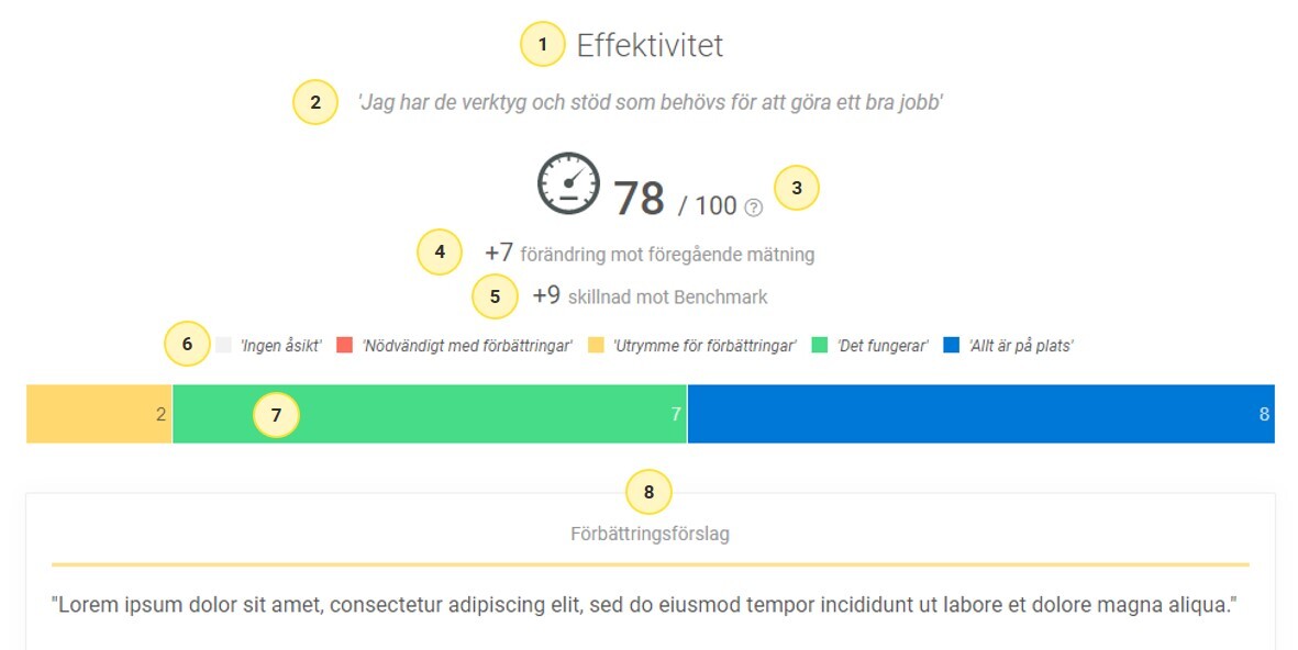 Spridningsrapporten visar en detaljerad nedbrytning av ett specifikt undersökningstillfälle, inklusive svarsfördelning, index och inkomna textkommentarer för varje enskild drivare. Nedan följer en beskrivning av de olika elementen i Spridningsrapporten (se bilden för nummerreferenser):
